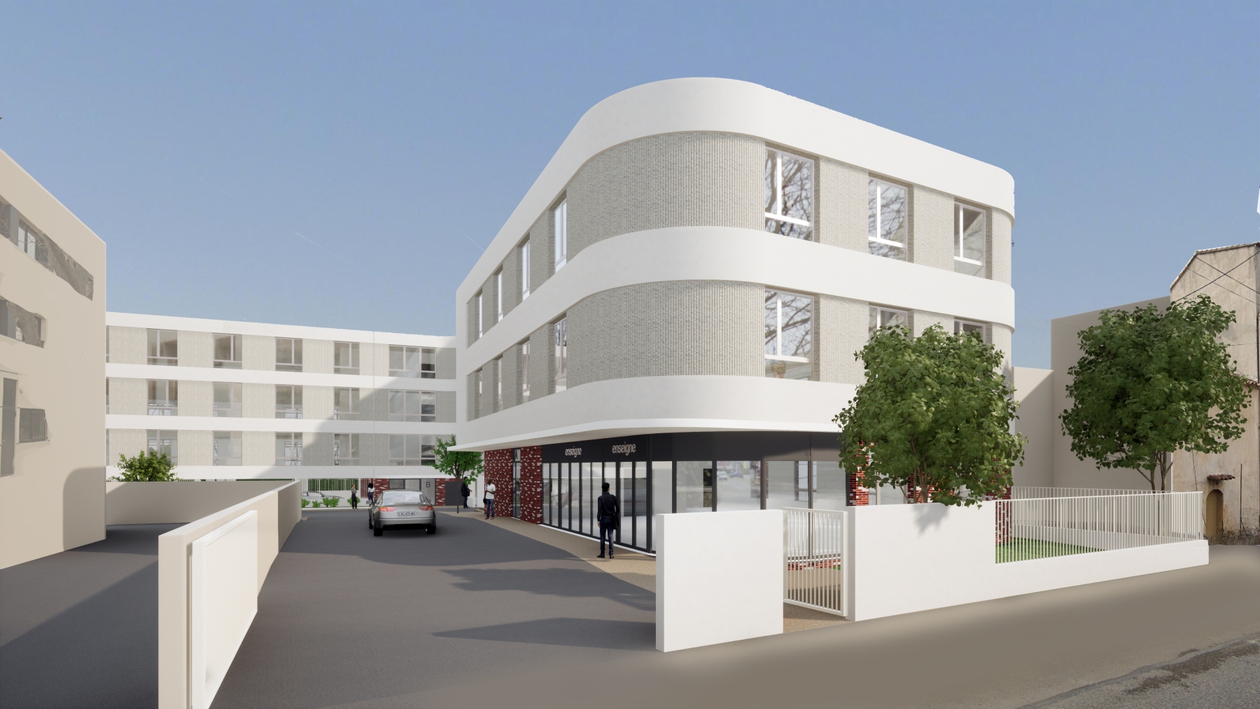 Une façade incitative est conçue sur l’accès côté route de la Légion, avec un soubassement vitré protégé par le débord des étages supérieurs. Composées en strates horizontales, alternance de matrice et de bandeaux purs, les façades s’enroulent et se défont suivant les angles adoucis et les ruptures d’altimétries des différents bâtiments. Des brises soleils en façade SUD donnent du dynamisme par leur variations.